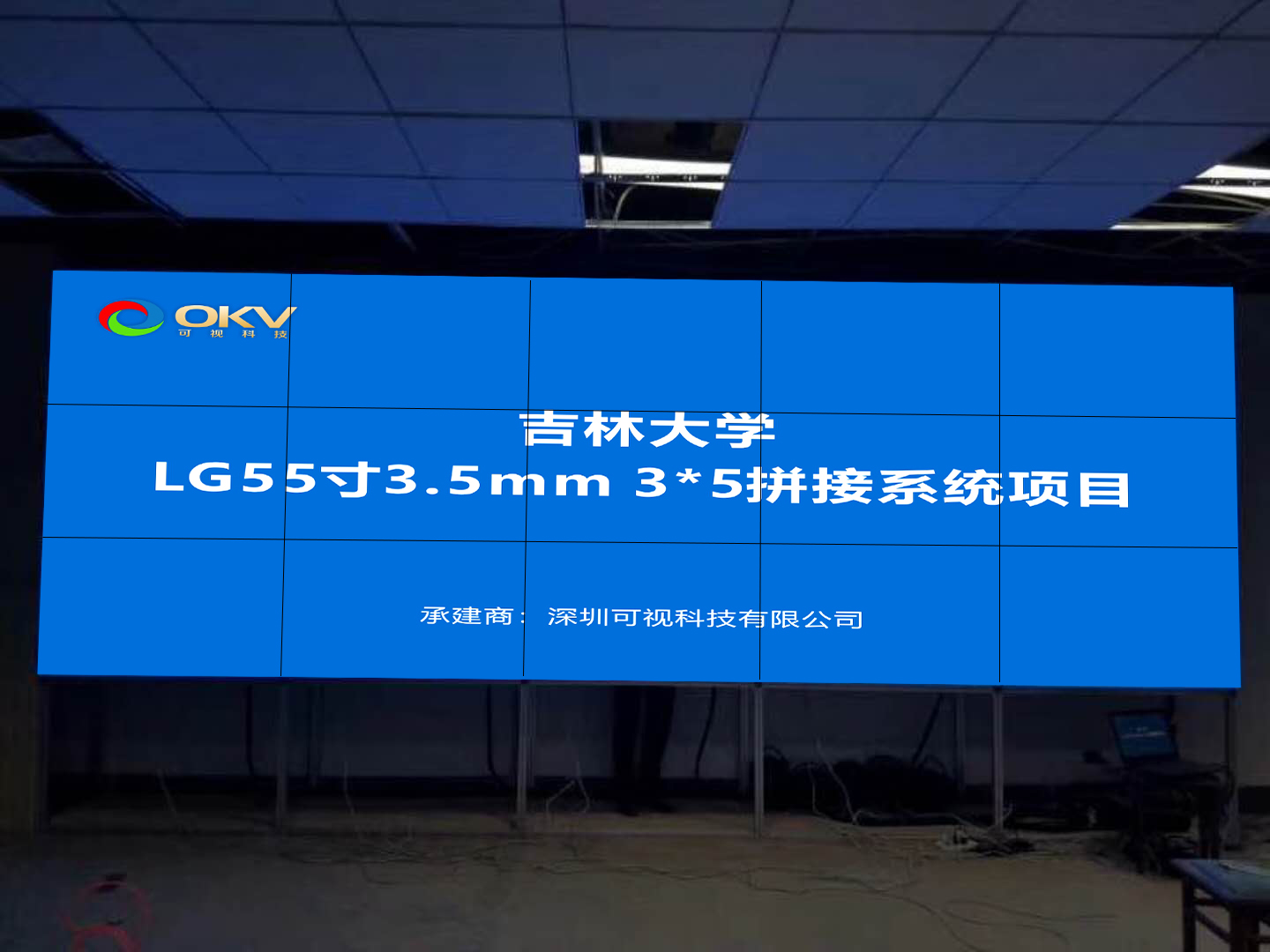 這次我們公司與吉林大學的合做項目采用的是LG原裝55寸拼接屏;拼接規模為3行5列共15塊屏的拼接矩陣,拼縫僅為3.5mm;采用落地支架安裝方式。